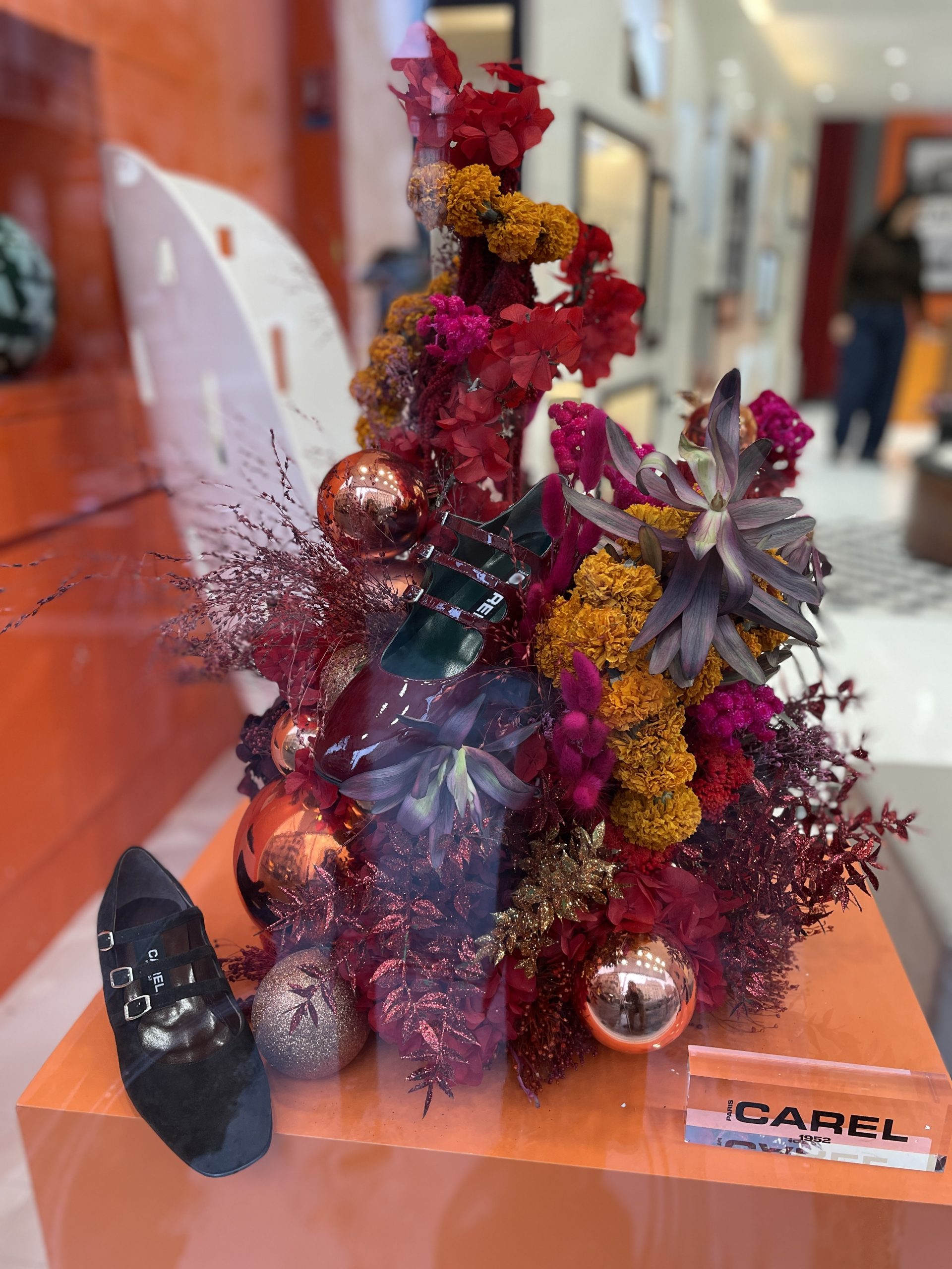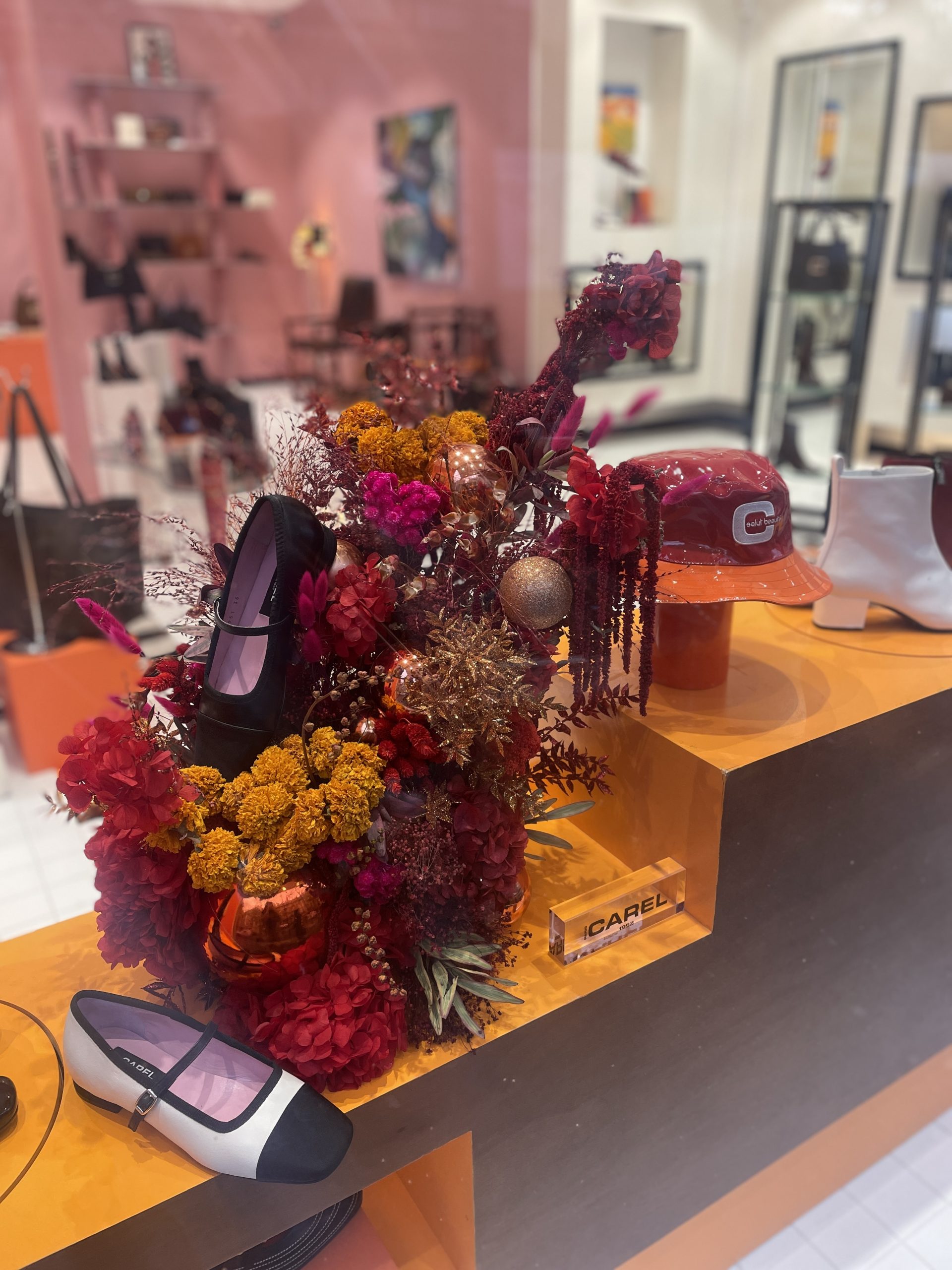 Création de sculptures de fleurs teintées et stabilisées pour les vitrines de la marque à l’occasion des fêtes de fin d’année.
