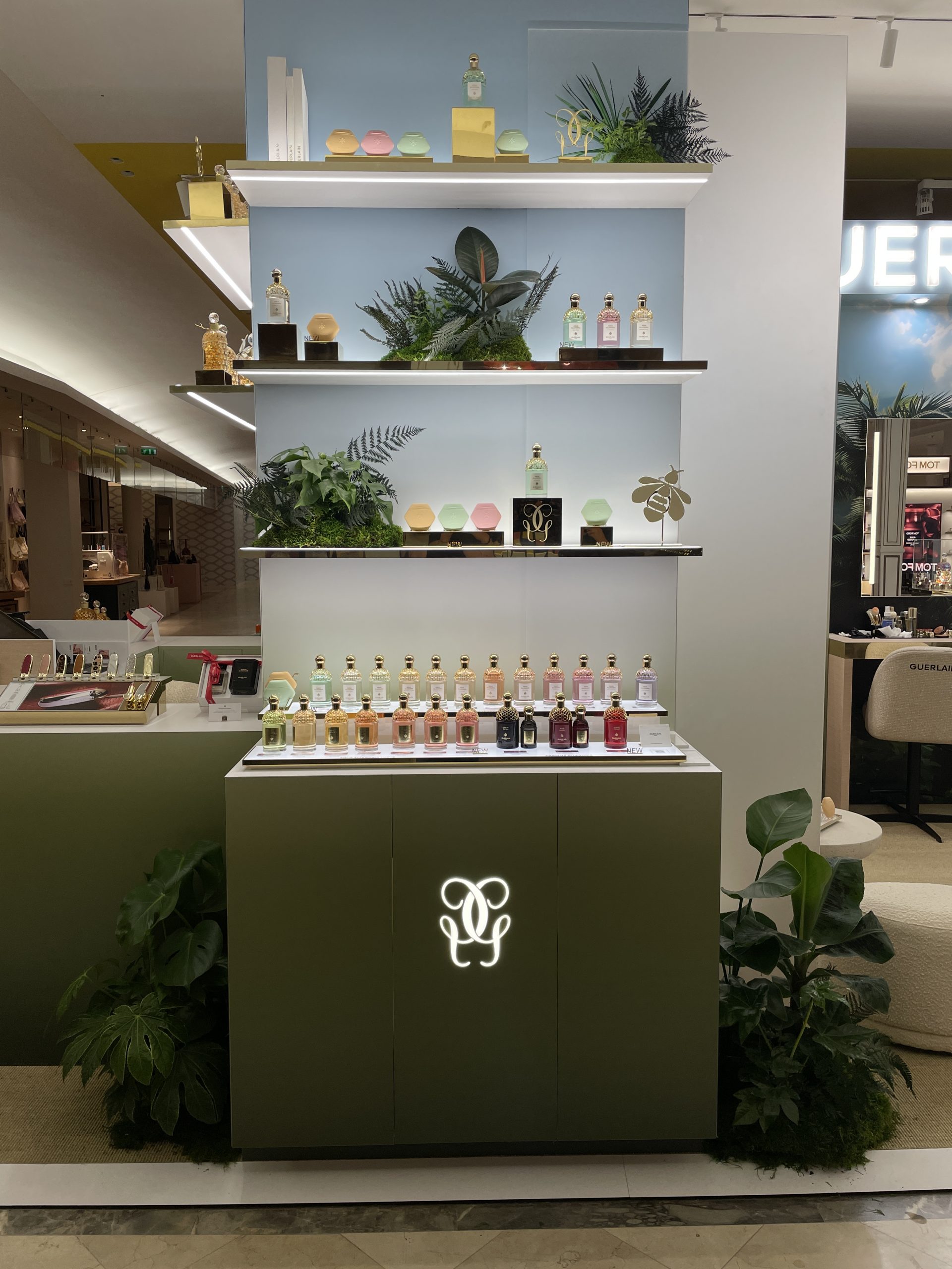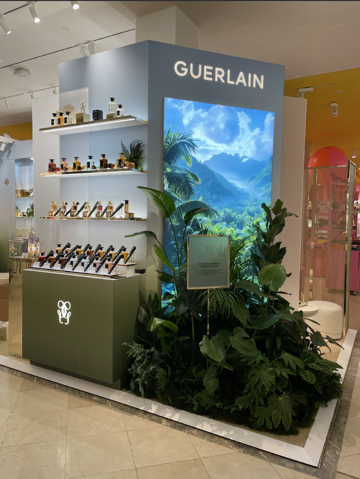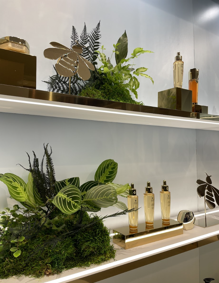 Végétalisation du podium Guerlain au Bon Marché durant plusieurs semaines à l’occasion de la sortie de nouveaux produits Aqua Allegoria.