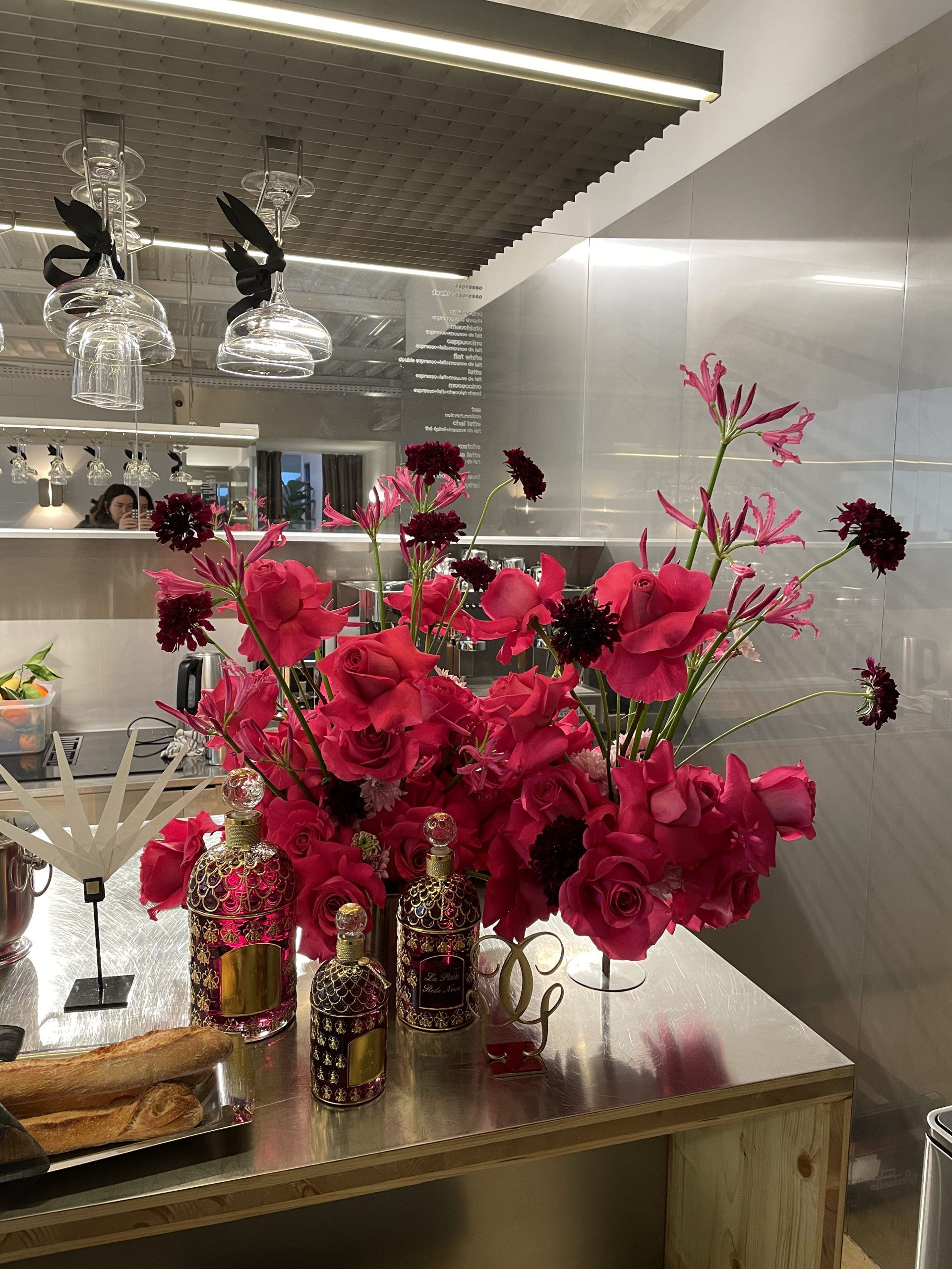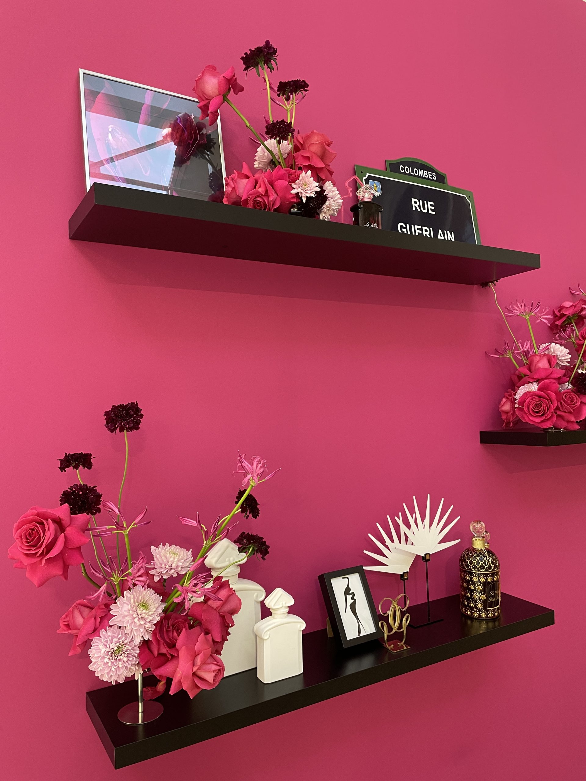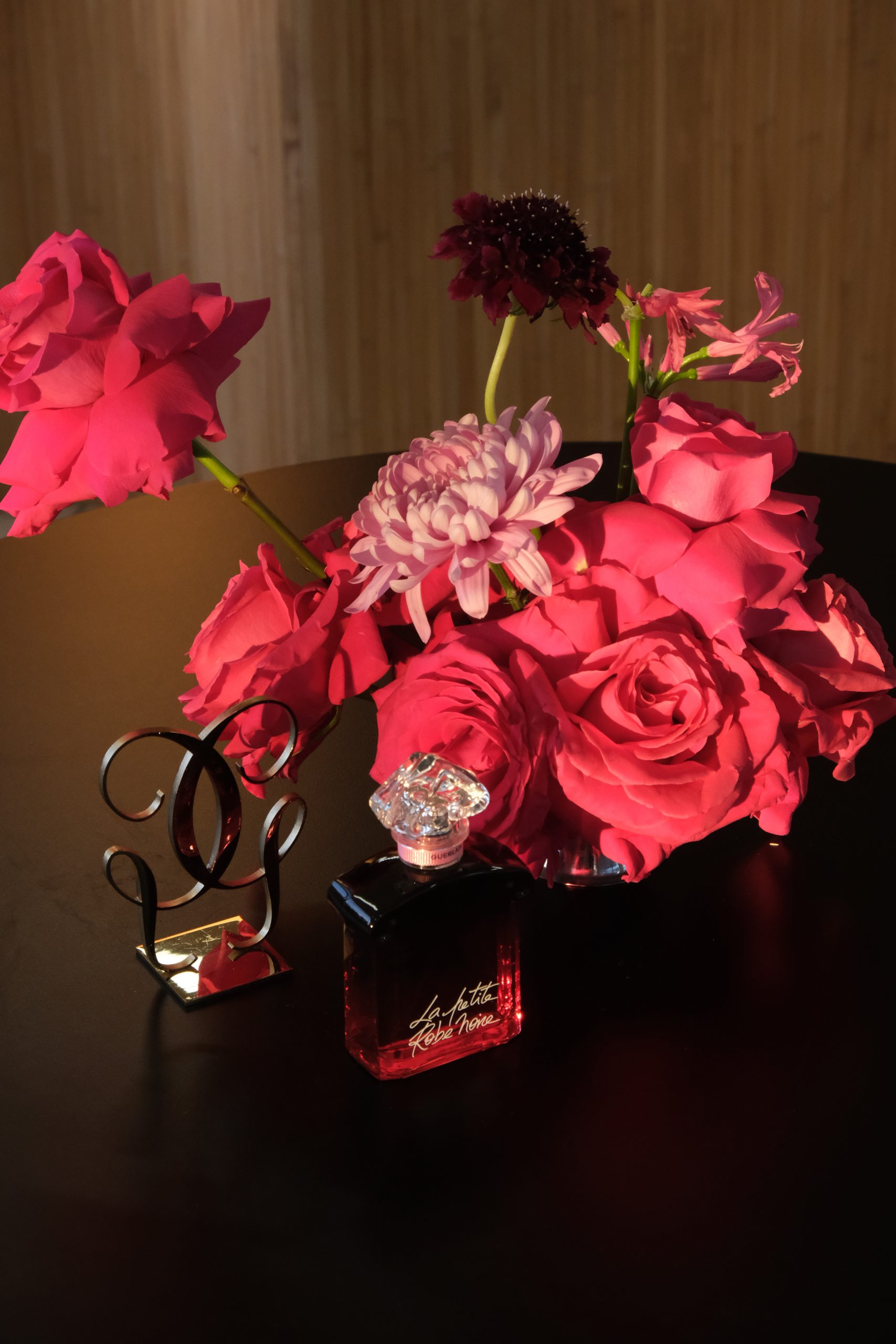 Création de compositions florales dans les codes couleurs du parfum phare de la marque, «La petite robe noire», mettant en avant un des ingrédients principaux de cette fragrance : la rose.