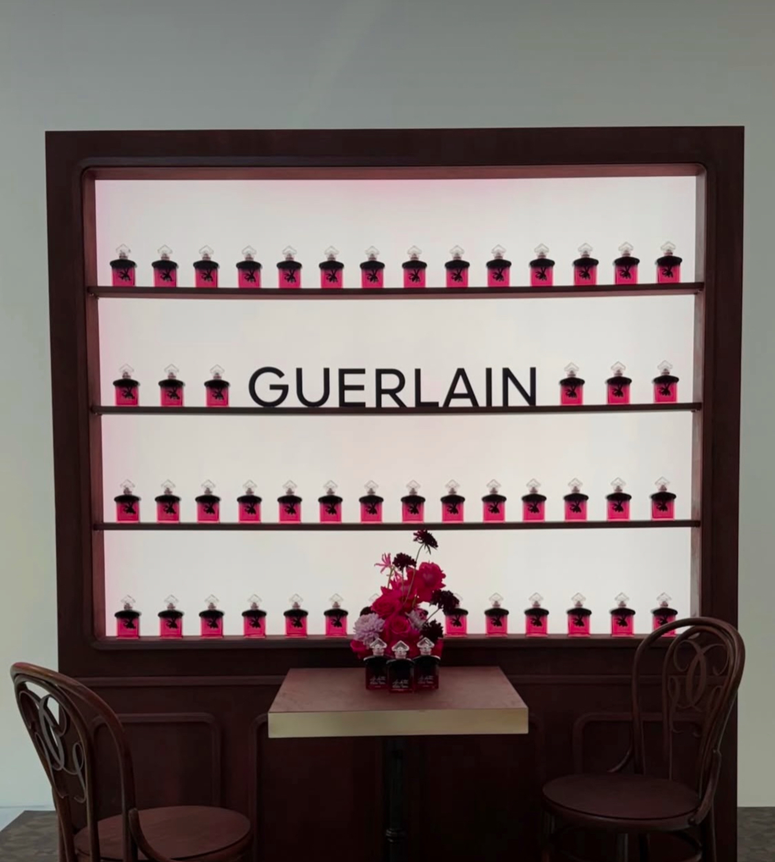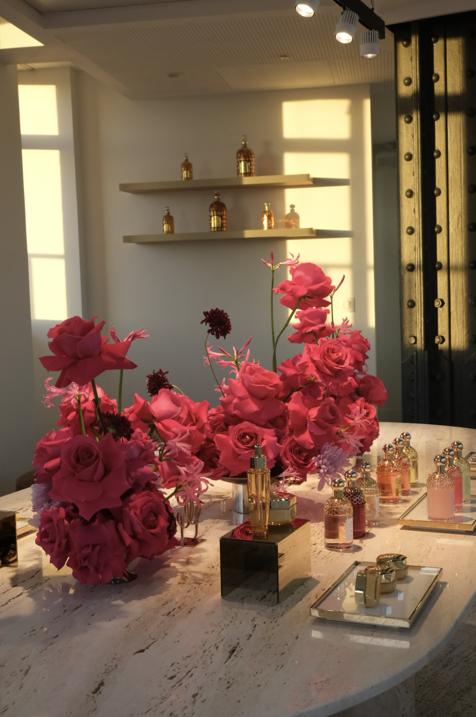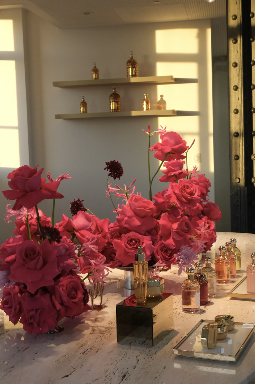 Création de compositions florales dans les codes couleurs du parfum phare de la marque, «La petite robe noire», mettant en avant un des ingrédients principaux de cette fragrance : la rose.